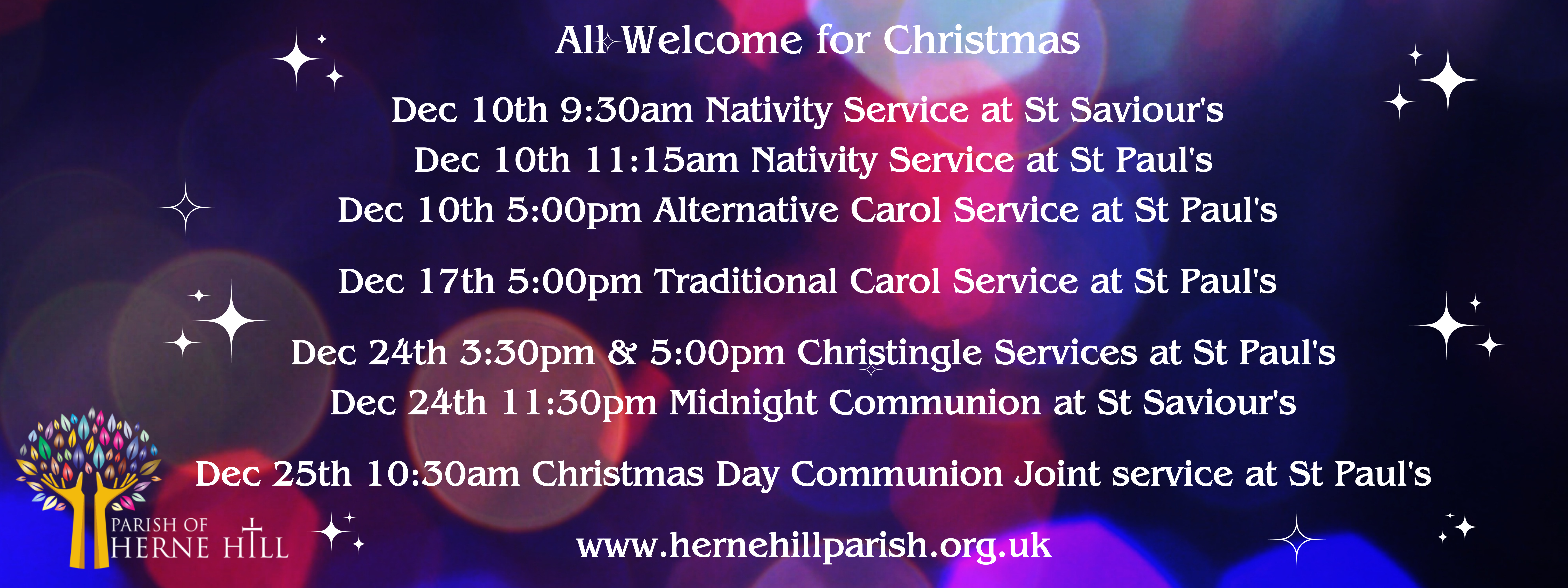 All welcome for an evening of Christmas Carol Singing followed by mulled wine and mince pies other festive food and drink. Our band will lead us in our Carol Singing as we journey through the Christmas Story together. We will also hear a short Christmas talk. All singing abilities welcome! If you prefer a traditional carol service we will be having one of them the following Sunday 17th December 5pm at St Paul's. Full details of all our services are on our website www.hernehillparish.org.uk