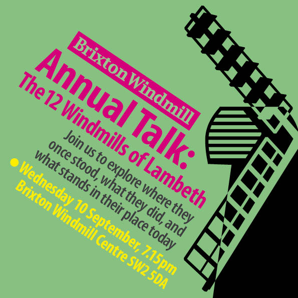 The 12 Windmills of Lambeth,Then and Now Join us to discover more about Lambeth's windmills. The talk is free but please register to reserve a place. Doors open at 6.45pm with refreshments and windmill shop available. https://www.brixtonwindmill.org/events/annualtalk/